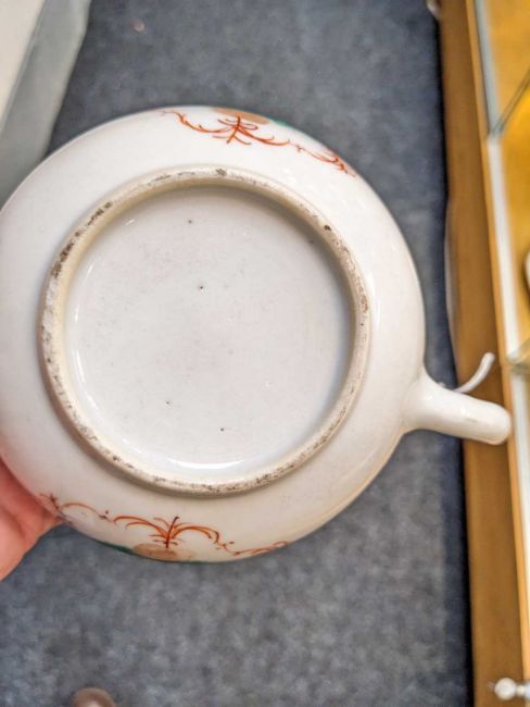 CHINESE FAMILLE VERTE EUROPEAN-SUBJECT TEAPOT & COVER, 18th C., of bullet form, decorated in the Meissen-style with a seated figure at a tea table within iron red shaped borders, all below gilt border at the neck, 20cms (w)Provenance: private collection south WalesComments: good overall, some ballpoint ink marks to interior.