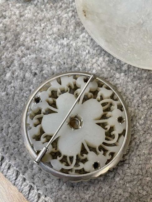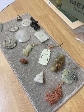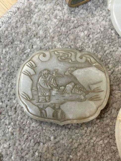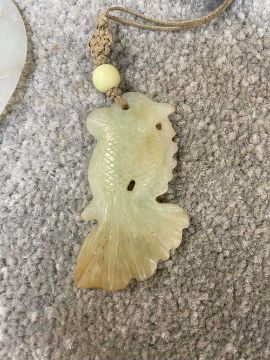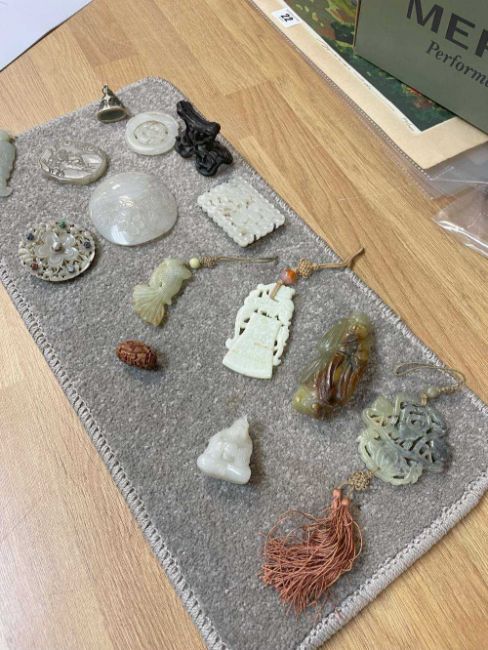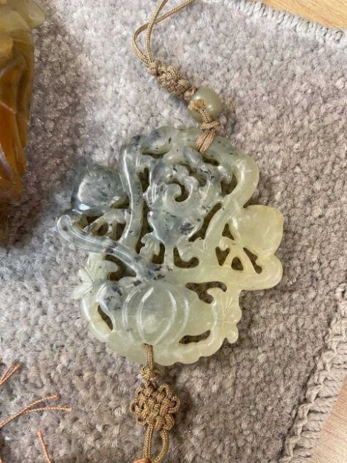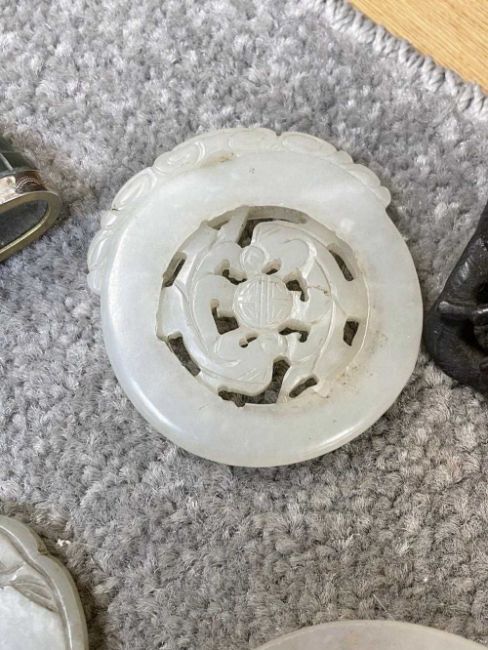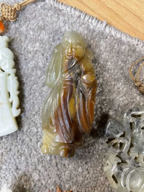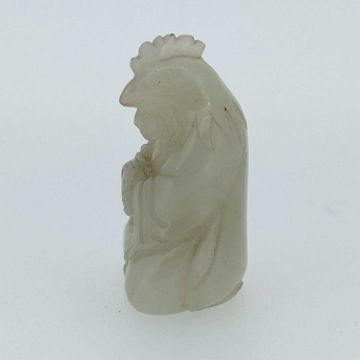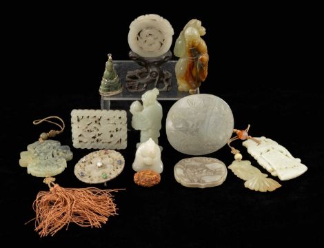 CHINESE PALE JADE ROOSTER HEAD ZODIAC FIGURE, late Qing Dynasty or later, seated in robes holding a ying/yang symbol, together with an assortment of hardstone/jade pendants with silk tassels, pierced filigree plaques mounted as brooches, Buddha pendant, etc. mostly post Qing dynasty (13)Provenance: private collection GwyneddNotes: Jade zodiac figures were originally produced under the direct commission of the Qianlong Emperor. They were placed around a central rectangular jade box carved with the Daoist qian trigram, a symbol of the Qianlong Emperor, thus they appear to have represented celestial guardians protecting the Emperor in all directions.