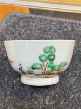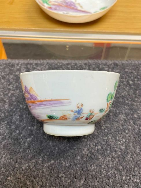 SET FOUR CHINESE FAMILLE ROSE TEA BOWLS & SAUCERS, late 18th C, decorated with an angler and attendant beside a bridge in a mountainous landscape (8)Provenance: private collection LiverpoolComment: 2 tea bowls with cracks/chips, all saucers with cracks/chips.