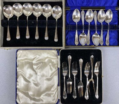 ASSORTED PLATED ITEMS & METALWARE including cutlery, some boxed, two circular muffin dishes and covers, Sheffield plated candlestick, brass saucepan with hollow steel handle, etc.Provenance: private collection Gwynedd