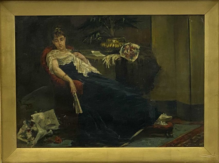 ‡ ALBERT LUDOVICI JR. (British, 1852 - 1932) oil on canvas - portrait of lady reclining in chair, signed and dated 1877 lower left, 31 x 42cmsProvenance: private collection ConwyComments: framed and glazed