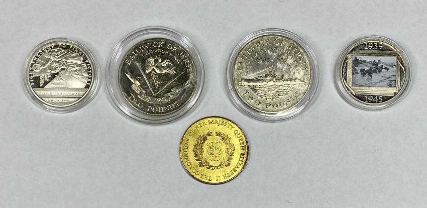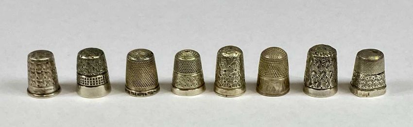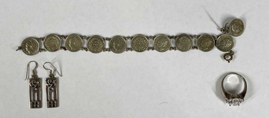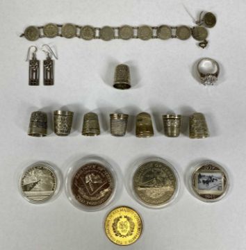 ASSORTED COLLECTABLES including four silver and two white metal thimbles, silver coin bracelet, silver ring, pair of silver earrings, and small group of coinsProvenance: private collection Wirral