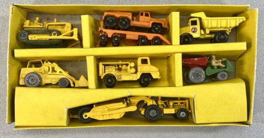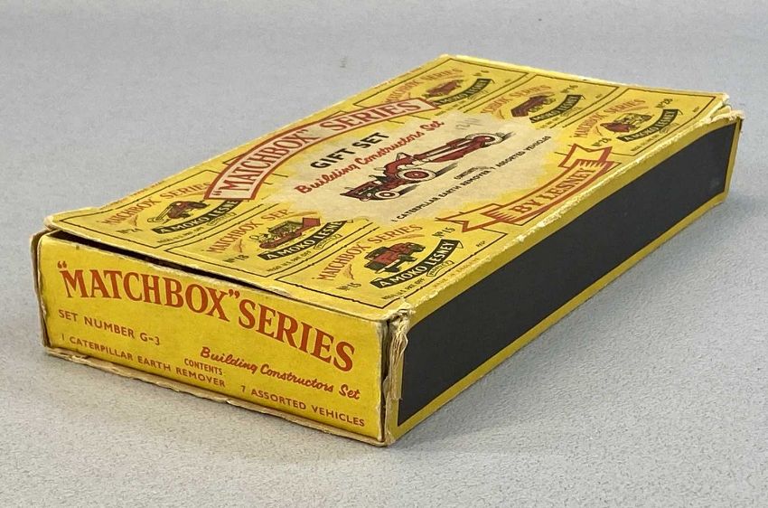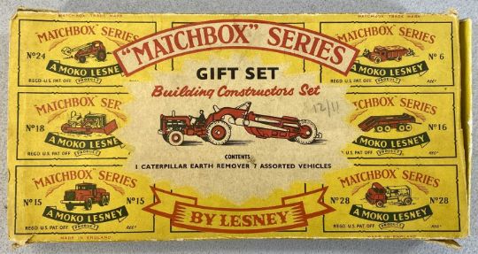SCARCE BOXED MATCHBOX LESNEY G-3 BUILDING CONSTRUCTORS GIFT SET, containing Caterpillar earth scraper, site dumper, quarry truck, tractor and trailer, Caterpillar bulldozer, excavator, and compressor truck, in original sliding tray card box with insertProvenance: private collection Conwy