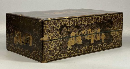 19TH CENTURY CHINOISERIE DECORATED LACQUERED & GILDED WRITING BOX, brass side handles, interior fitted with lined writing slope and compartments with a drawer to one end, 16 (h) x 43 (w) x 26cms (d)Provenance: private collection Ynys Môn