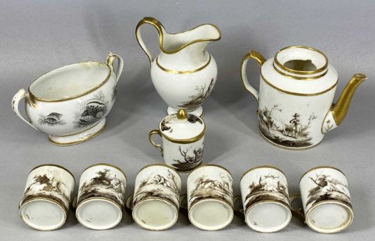 PORCELAIN TEA SERVICE, LATE 19TH/EARLY 20TH CENTURY, bat-printed decoration, farmer, cow and rural landscape, 15 pieces, with other similarly decorated teaware