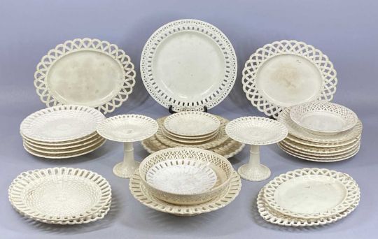 LARGE SELECTION OF CREAM BASKET WEAVE TABLEWARE, late 18th/early 19th century, including various sized plates, two small comports, small oval lidded tureen, etc.Provenance: first small consignment from The Cornelia Bayley Collection from the historic Welsh Jacobean house, Plas Teg, Flintshire. Further auctions to follow including Plas Teg Principal Interiors, further details on this important Jacobean house - Welsh House Clearance of a Generation — Rogers Jones Co