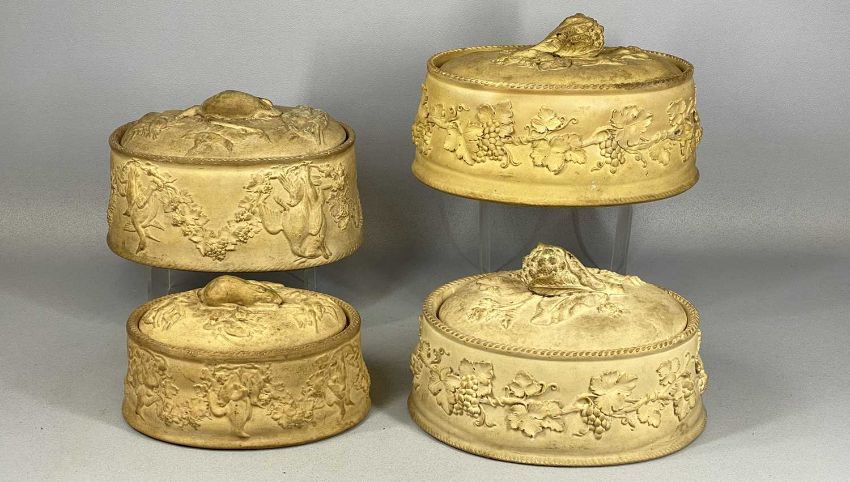 FOUR WEDGWOOD CANEWARE OVAL GAME PIE DISHES & COVERS, c. 1880, with moulded relief decoration, 18 (h) x 29.5 (w) x 21.5cms (d) the largest, with four Portmeirion white glazed oval game dishes and covers, 18 (h) x 26.5 (w) x 22cms the largestProvenance: first small consignment from The Cornelia Bayley Collection from the historic Welsh Jacobean house, Plas Teg, Flintshire. Further auctions to follow including Plas Teg Principal Interiors, further details on this important Jacobean house - Welsh House Clearance of a Generation — Rogers Jones Co
