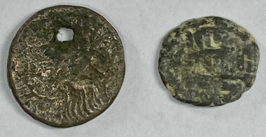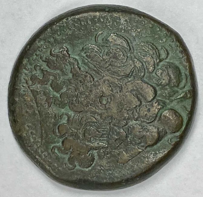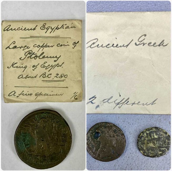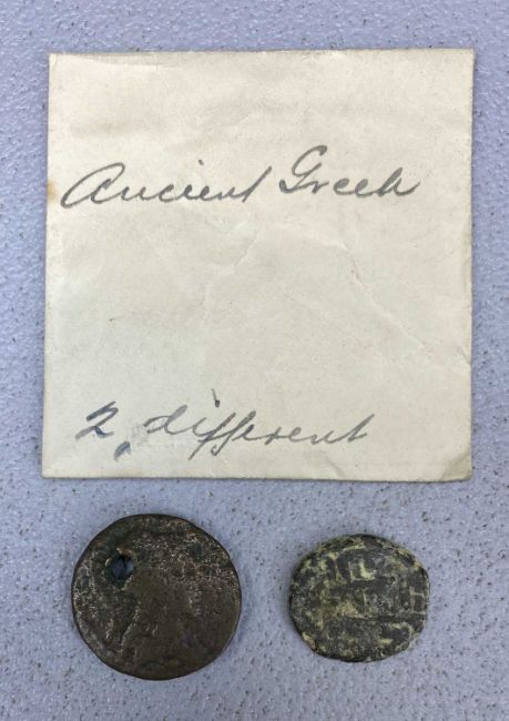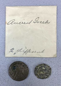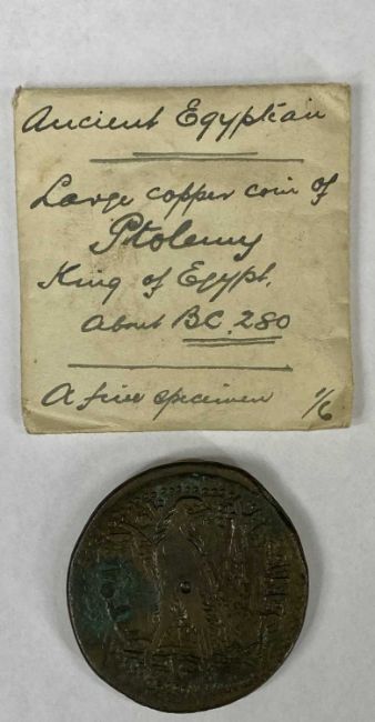 LARGE EGYPTIAN COPPER COIN OF PTOLEMY, reverse with standing eagle, 46.5gms, 40mms (diam.) minimum, with two ancient Greek coinsProvenance: Merseyside solicitor's estate instruction