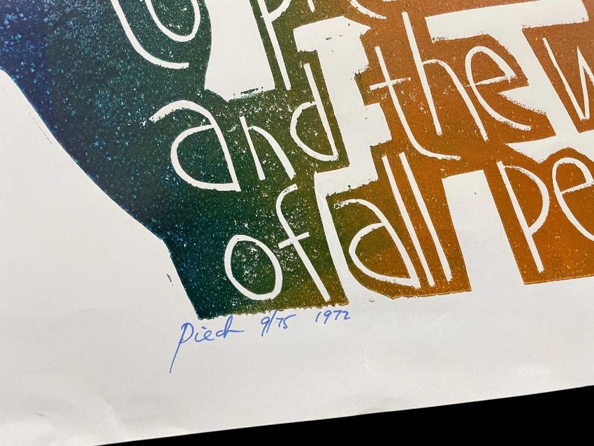 ‡ PAUL PETER PIECH (American-Welsh 1920-1996) two woodcut prints - limited edition (63/150) two colour print with quote from Jesus Christ, 'Treat Other People as You Would Like to be Treated..', signed and dated 1970, 43 x 64cms together with another limited edition (9/75) print with quote from John F Kennedy, 'Peace Does Not Rest...', signed and dated 1972, 51 x 76cmsProvenance: were gifted by the artist to the Bertrand Russell Peace Foundation, proceeds will help pay for renovations of Russell's old home in CornwallComments: both unframed
