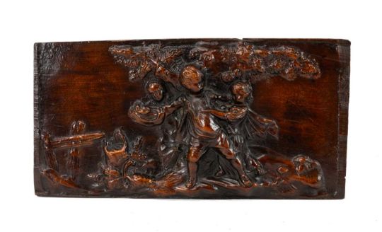 RELIEF-CARVED TREEN FIGURAL PLAQUE, depicting rustic children playing beneath a tree, 16.5 x 31.5cmsProvenance: deceased estate CardiffComments: reglued corner