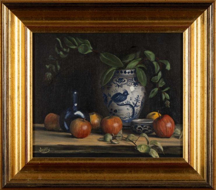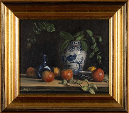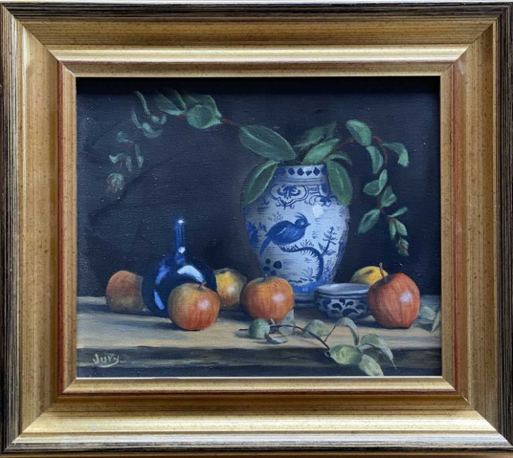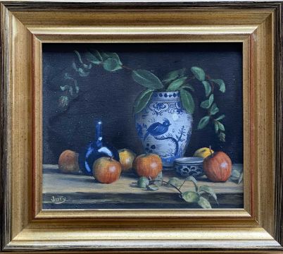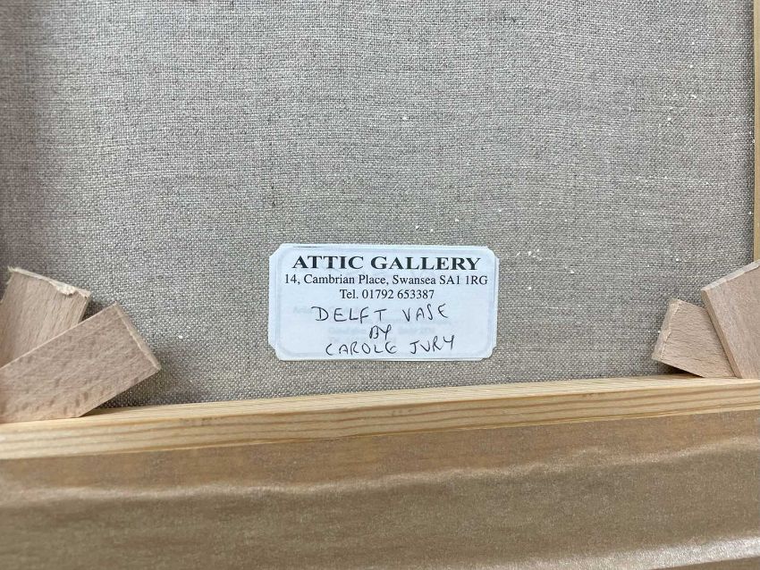 ‡ CAROLE JURY oil on canvas - entitled verso, 'Delft Vase' on Attic Gallery label, signed, 24.5 x 29.5cmsProvenance; private collection SwanseaComments: framed