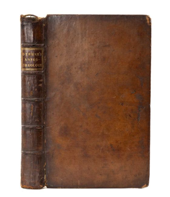 DERHAM (W) Astro-Theology: Or, A Demonstration of the Being and Attributes of God, from a Survey of the Heavens, 8th edition, three folding engraved plates at the end, published by William Innys, contemporary panelled calf boards, London: W Innys, 1741, 8vo.Provenance: sold on behalf of Gregynog Hall, surplus to the collectionComments: toning, bumps and rubbing.