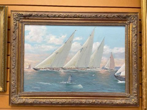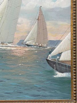 ‡ MICHAEL J. WHITEHAND (British, b. 1941) oil on canvas - 'Britannia, Shamrock & Astra Racing Off The Solent', signed, titled verso, 49.5 x 74.5cmsAuctioneer's Note: born in Bridlington, East Yorkshire, Whitehand is a self-taught artist specialising in maritime scenes.Provenance: private collection Cardiff.Comments: framed ready to hang