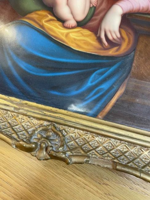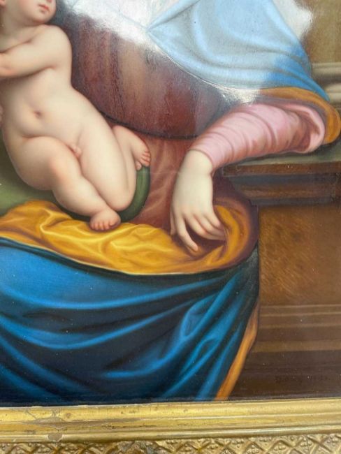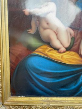 GERMAN PAINTED PORCELAIN PLAQUE, probably KPM, depicting The Madonna of the Cherries after Joos van Cleve, 27 x 20cmsProvenance: deceased estate CardiffComments: frame with marginal losses to gesso.