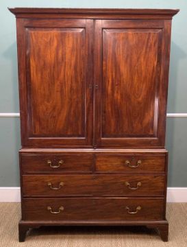 GEORGE III MAHOGANY LINEN PRESS, panelled doors, five slides, chest base, bracket feet, 185 (h) x 125 (w) x 65cms (d)Provenance: deceased estate CardiffComments: drawer mouldings damaged, side base mouldings damaged, cupboard doors both warped, sides with cracks, etc.