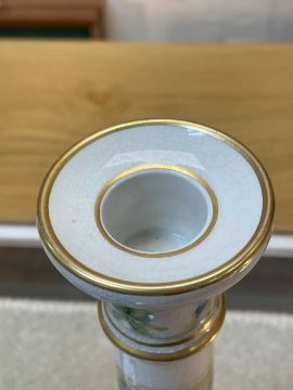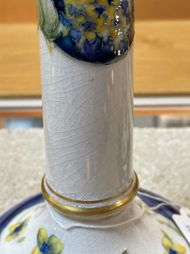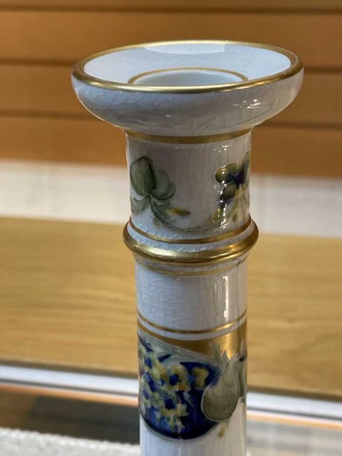 WILLIAM MOORCROFT FOR JAMES MACINTYRE & CO: PAIR OF FLORIAN CANDLESTICKS, painted in blue, yellow and green with gilt highlights, brown printed mark and green signature marks under, 20cms (h)Provenance: private collection GwyneddComments: minor gilt rubbed, crazed glaze as expected