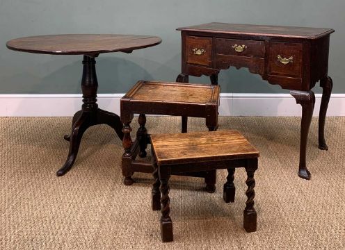 FIVE ANTIQUE OAK FURNITURE ITEMS comprising, 18th C. mahogany crossbanded lowboy, mahogany crossbanded hanging corner cupboard, two joined stools and tripod table (5)Provenance: deceased estate CardiffComments: some veneer losses, loose joints and missing elements, alterations, inspection advised