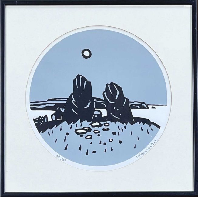 ‡ SIR KYFFIN WILLIAMS RA limited edition (154/500) coloured screenprint - circular format, 'The Two Standing Stones', fully signed in pencil, 30cms diameterProvenance: private collection GwyneddComments: framed, glazed