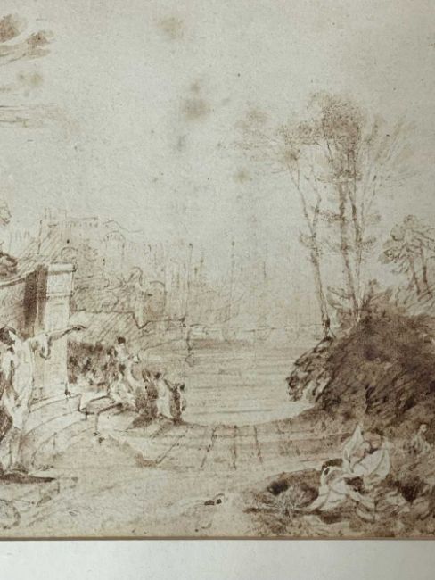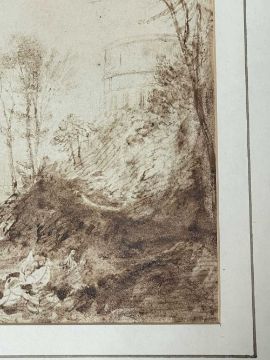 ATTR. TO JOSEPH MALLORD WILLIAM TURNER RA (British 1775 - 1851) sepia sketch on paper - Greek scene with figures, possibly Adriana Tivoli, signed with initials, 12 x 19cmsProvenance: private collection LondonComments: framed and glazed