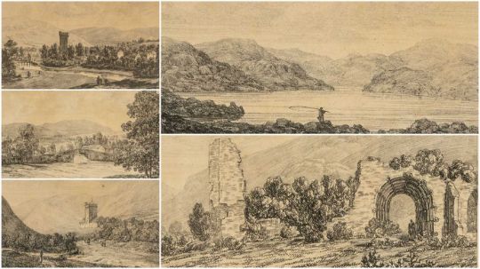 J. G. WOOD etchings (set of five) - including, Tregarron, Strata Florida Abbey, Llanddewi Brevi, The Source of the Teivy and Pentre Rhydfendiged, all published by Jno. Geo. Wood 1812, London, all 18 x 25cms (5)Provenance: private collection SwanseaComments: all five framed, glazed