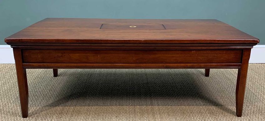 R.E.H. KENNEDY FURNITURE FOR HARRODS: 'TRADITIONAL COLLECTION' CHERRY COFFEE TABLE, model 4041, with internal storage compartment accessed via central lid with brass pull, 46 (h) x 130 (w) x 82cms (d)Provenance: private collection SwanseaComments: minor stains/bumps/scratches but overall good