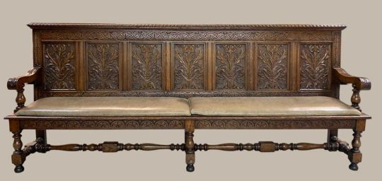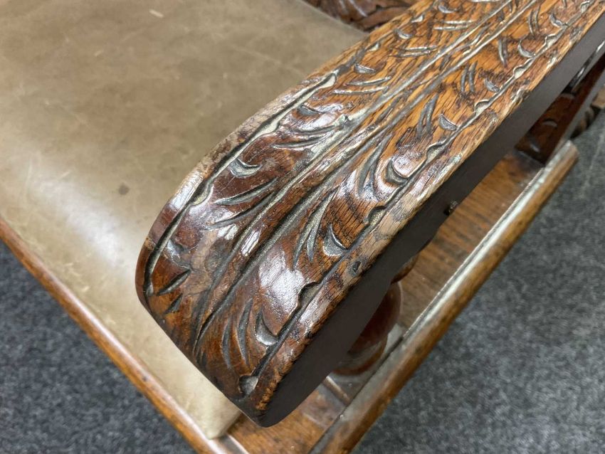 LARGE VICTORIAN CARVED OAK SETTLE, ensuite to the previous lot, with seven foliate carved back panels, vert de terre 'leather' upholstered seats, turned h-stretchers, 114 (h) x 275 (w) x 52cms (d)Provenance: private collection CardiffComments: minor stains to upholstery, inspection advised, large and heavy - requires minimum of two people to collect