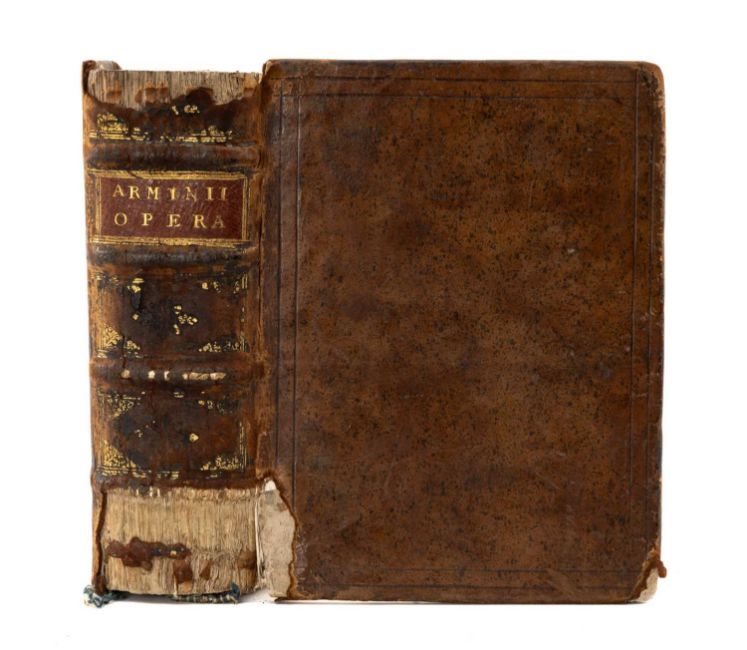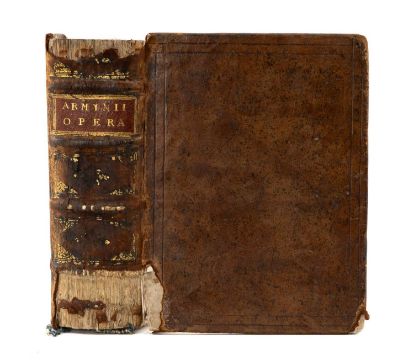 ARMINIUS (JACOBUS), Opera Theologica, Leiden, Govert Basson, 1629, text in double column, stamped for The Theological College, Bala, and library stamp, spotted contemporary panelled calf boards, gilt lettering to compartmented spine, 966pp, 4to.Provenance: sold on behalf of Gregynog Hall, surplus to the collectionComments: toning, bumps and rubbing, flyleaf corner cut, owner inscription, partial spine panel loss, binding loose, inspection advised.