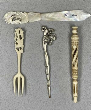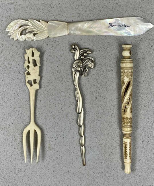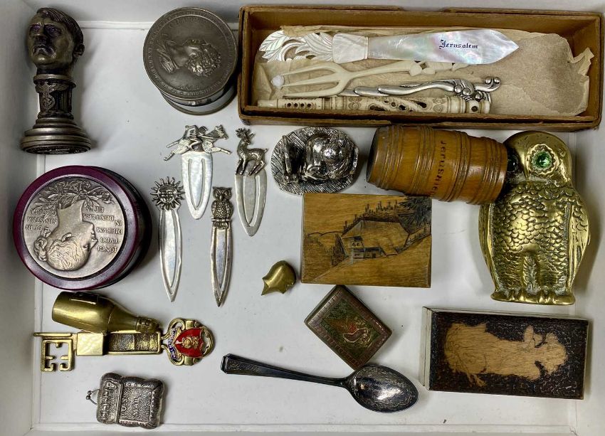 ASSORTED COLLECTABLES, including bone Stanhope, 13cms (l), two circular reproduction snuff boxes, Jerusalem mother of pearl letter opener, three white-metal page markers, pokerwork stamp box, etc.Provenance: private collection Greater Manchester