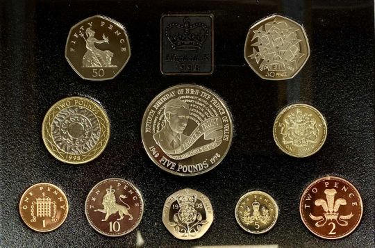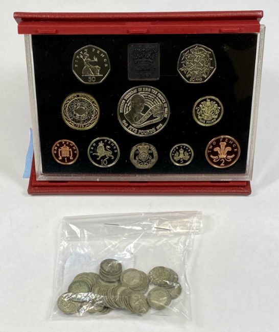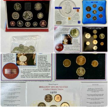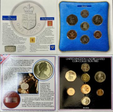 UNITED KINGDOM COLLECTABLE COIN SETS, 1998 Deluxe Proof set, and four uncirculated coin collection sets, 1983 (2), 1986, and 1988, with a collection of fifty 3d coins, mainly George V, 70gmsProvenance: private collection Wirral