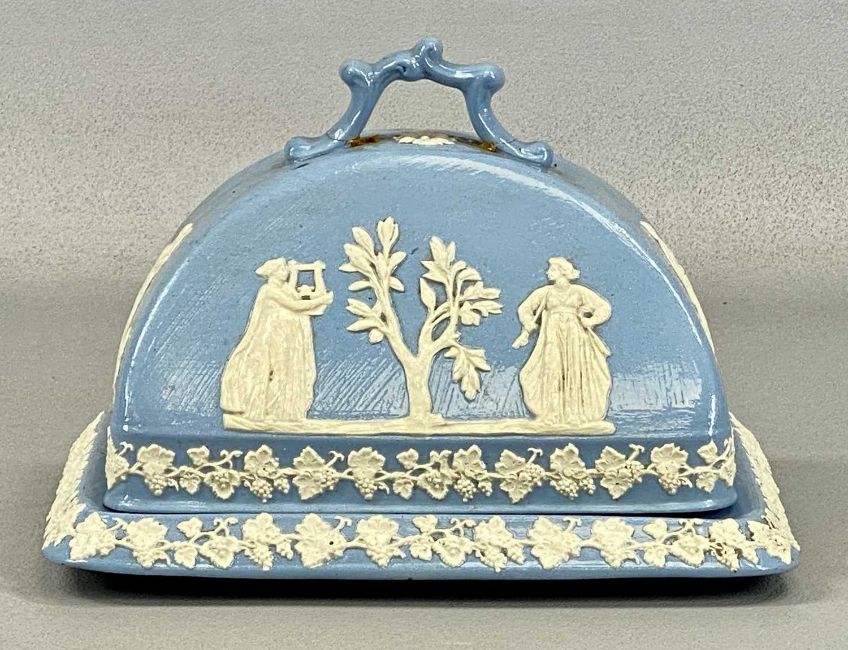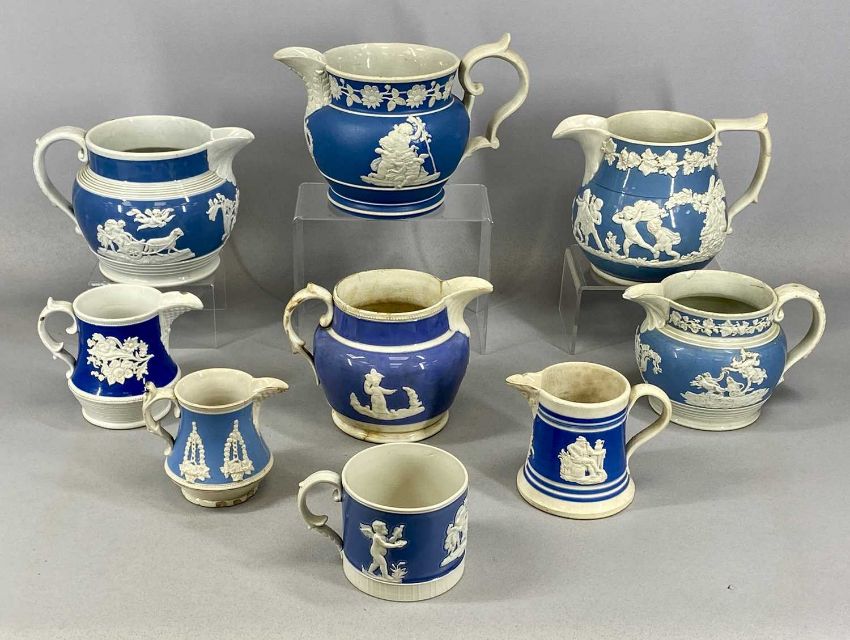 ASSORTED 19TH CENTURY BLUE & WHITE CERAMICS, including Dudson rectangular cheese dish and cover, 24cms (h), tall circular stoneware cheese dish cover with moulded decoration, lattice work, wheat sheaves, and floral finial, 29cms (h), and various jugs with applied decoration, 17cms (h) the tallestProvenance: The Cornelia Bayley Collection from the historic Welsh Jacobean house, Plas Teg, Flintshire. Further auctions to follow including Plas Teg Principal Interiors, further details on this important Jacobean house and its clearance Welsh House Clearance of a Generation — Rogers Jones Co