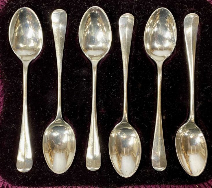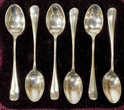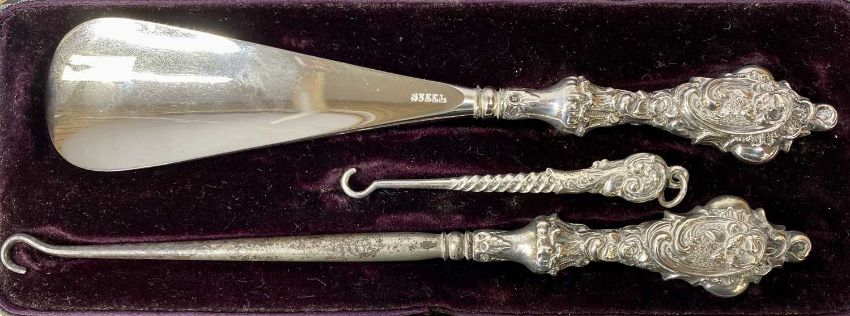 CASED SILVERWARE, including silver-handled shoe horn and two button hooks, six bead pattern silver teaspoons and tongs, and six rattail pattern teaspoonsProvenance: deceased estate Conwy
