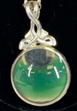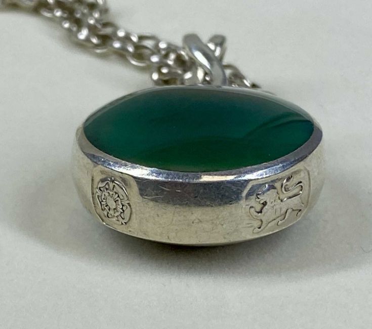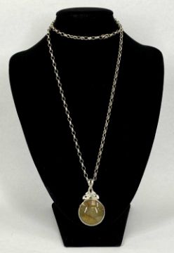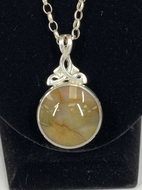 SILVER CELTIC FORM PENDANT & CHAIN, with large polished double sided agate stone, unusual silver mount with feature hallmarks and Celtic design hanger, David Scott-Walker, Sheffield 1988, and long open link silver chain, in presentation boxProvenance: private collection Denbighshire