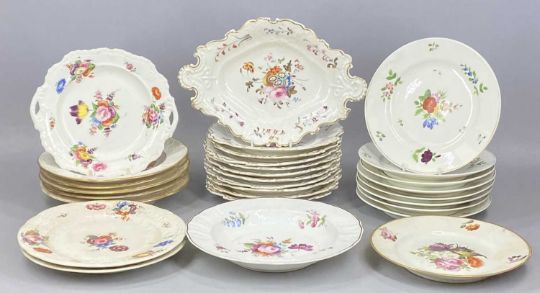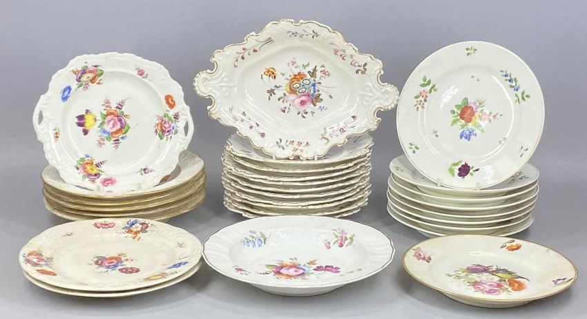 BLOOR DERBY, DAVENPORT, DERBY and other makes, an assortment of floral hand-painted plates, dishes, jug and bowl, etc. approx. 60 piecesProvenance: The Cornelia Bayley Collection from the historic Welsh Jacobean house, Plas Teg, Flintshire. Further auctions to follow including Plas Teg Principal Interiors, further details on this important Jacobean house and its clearance Welsh House Clearance of a Generation — Rogers Jones Co