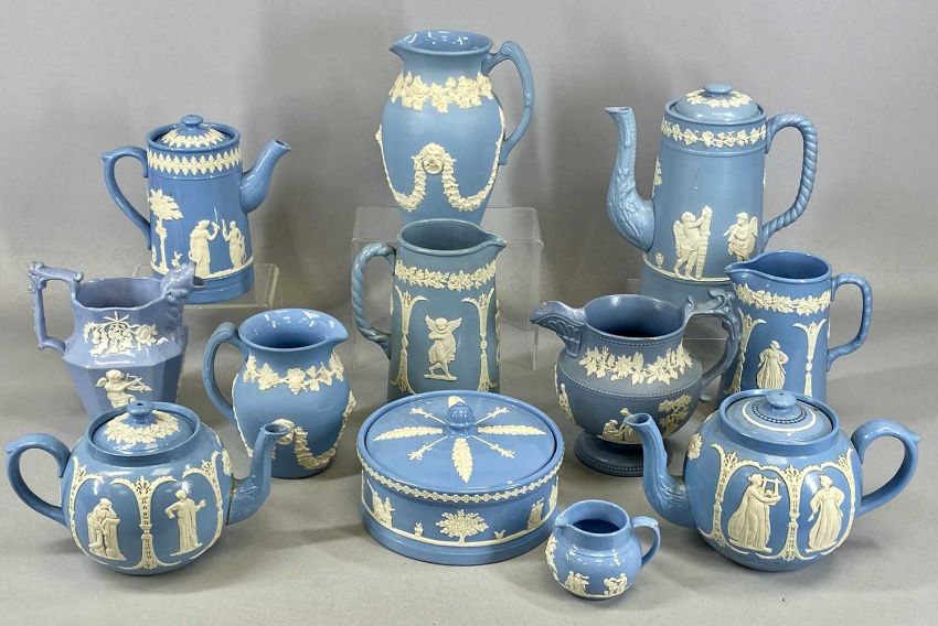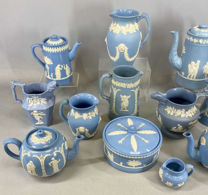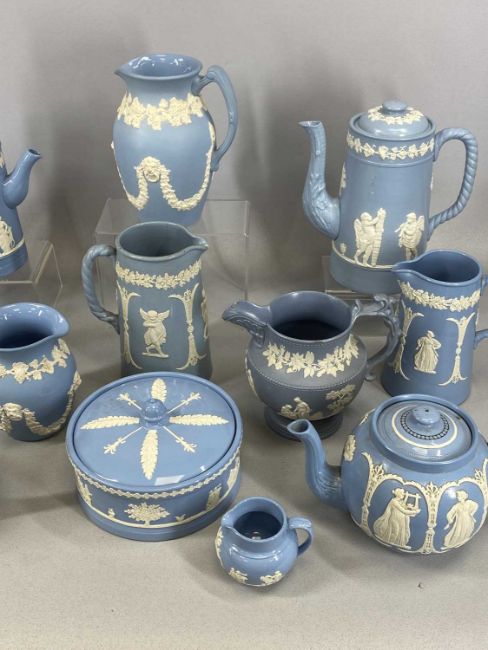 COLLECTION OF DUDSON & OTHER BLUE & WHITE JASPERWARE, including coffee pot with twist turned handle, 24cms (h), three jugs, 20cms (h) the tallest, two circular teapots, 16cms (h) the tallest, etc.Provenance: The Cornelia Bayley Collection from the historic Welsh Jacobean house, Plas Teg, Flintshire. Further auctions to follow including Plas Teg Principal Interiors, further details on this important Jacobean house and its clearance Welsh House Clearance of a Generation — Rogers Jones Co