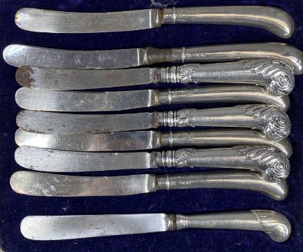 ASSORTMENT OF CUTLERY, including six George V silver gilt teaspoons, Henry James Hulbert, London 1919, four gilt-metal anointing spoons, and nine various silver-handled dessert knivesProvenance: The Cornelia Bayley Collection from the historic Welsh Jacobean house, Plas Teg, Flintshire. Further auctions to follow including Plas Teg Principal Interiors, further details on this important Jacobean house and its clearance Welsh House Clearance of a Generation — Rogers Jones Co