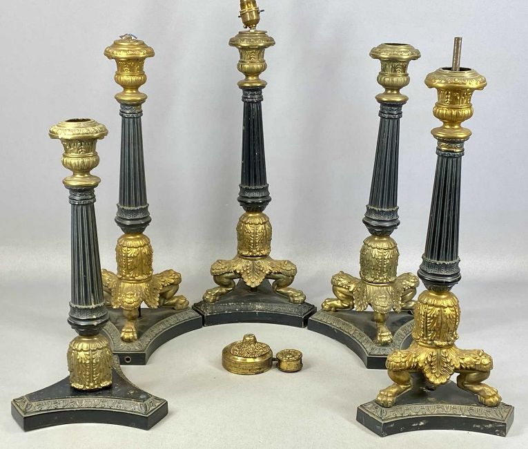 FOUR FRENCH NEOCLASSICAL STYLE TABLE LAMPS, with partially gilded columns, on trefoil bases, 49cms (h)Provenance: The Cornelia Bayley Collection from the historic Welsh Jacobean house, Plas Teg, Flintshire. Further auctions to follow including Plas Teg Principal Interiors, further details on this important Jacobean house and its clearance Welsh House Clearance of a Generation — Rogers Jones CoComments: with spares
