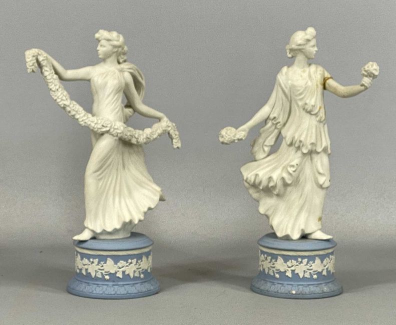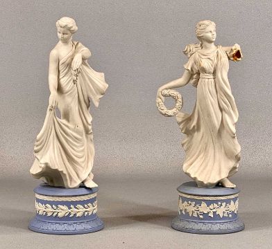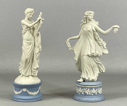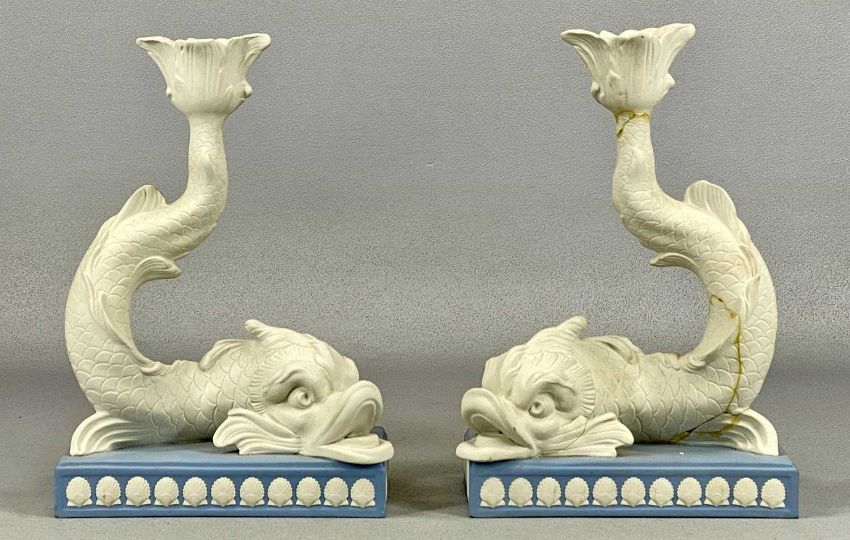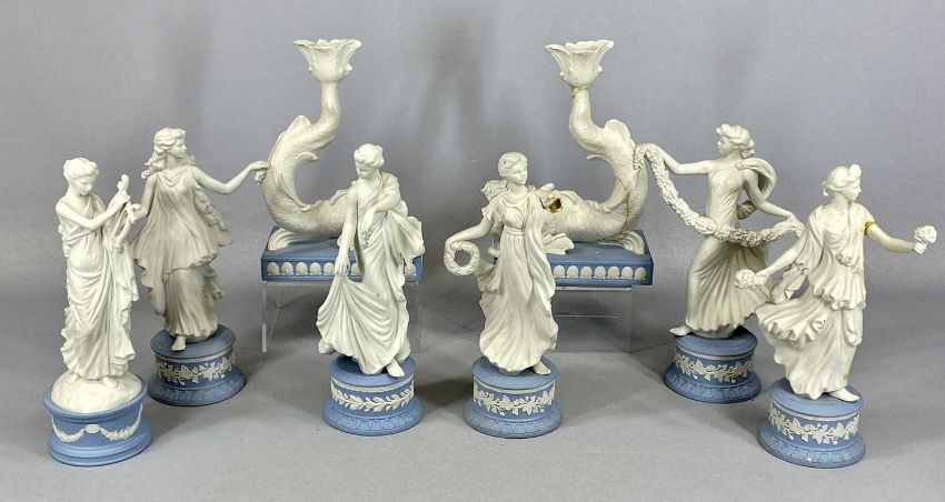 WEDGWOOD LIGHT BLUE & WHITE JASPERWARE, including figures of six classical muses, impressed marks, 27cms (h), and pair of dolphin candlesticks 2000, limited edition of 500, impressed and printed marks, 25cms (h)Provenance: The Cornelia Bayley Collection from the historic Welsh Jacobean house, Plas Teg, Flintshire. Further auctions to follow including Plas Teg Principal Interiors, further details on this important Jacobean house and its clearance Welsh House Clearance of a Generation — Rogers Jones Co