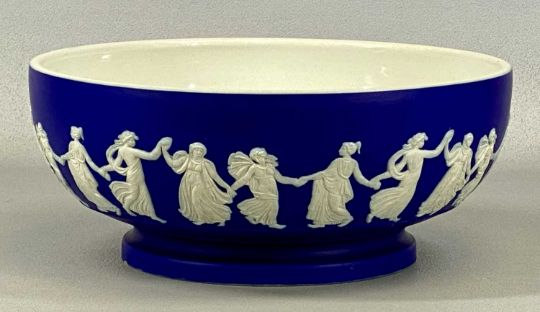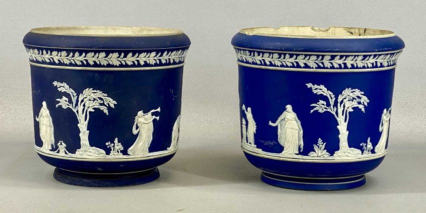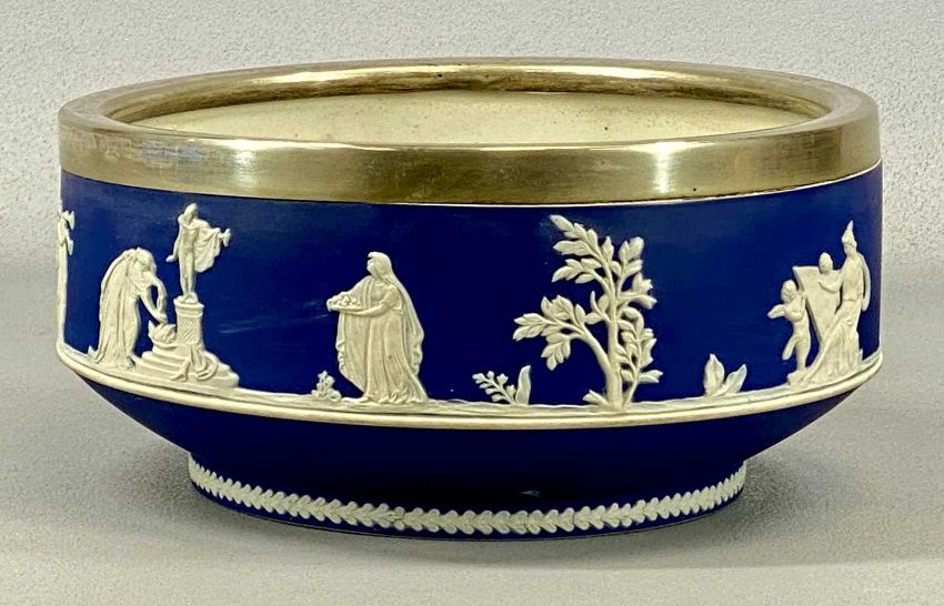 WEDGWOOD / WEDGWOOD STYLE BLUE & WHITE JASPERWARE, circular bowl with plated rim, 23cms (diam.), circular fruit bowl, 27cms (diam.), and two circular jardinières, 20cms (h)Provenance: The Cornelia Bayley Collection from the historic Welsh Jacobean house, Plas Teg, Flintshire. Further auctions to follow including Plas Teg Principal Interiors, further details on this important Jacobean house and its clearance Welsh House Clearance of a Generation — Rogers Jones Co