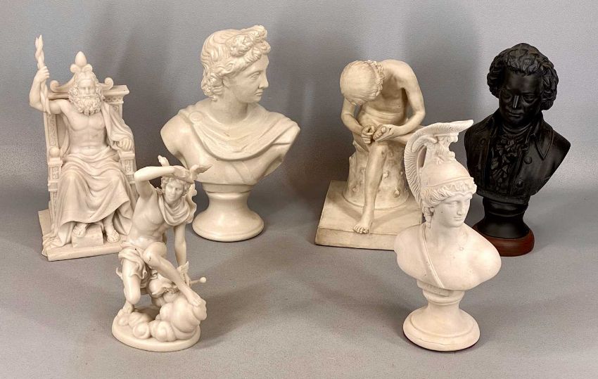 ASSORTED CONTEMPORARY COMPOSITE BUSTS, including Mozart, 30cms (h), Mars, 28cms (h), Apollo, 31cms (h), Spinario, 27cms (h), Hermes (Mercury), 23cms (h), and Zeus, 32cms (h)Provenance: The Cornelia Bayley Collection from the historic Welsh Jacobean house, Plas Teg, Flintshire. Further auctions to follow including Plas Teg Principal Interiors, further details on this important Jacobean house and its clearance Welsh House Clearance of a Generation — Rogers Jones Co