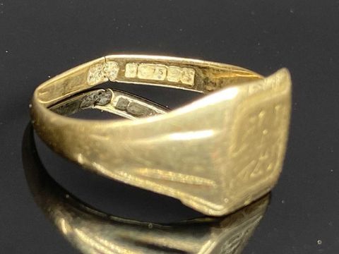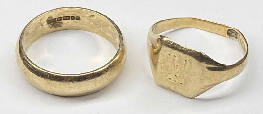 9CT GOLD WEDDING BAND, size R/S, and 9ct gold signet ring (cut), 8gms grossProvenance: private collection Conwy