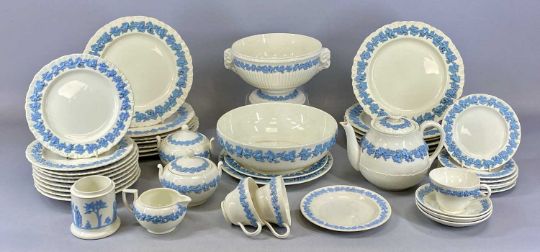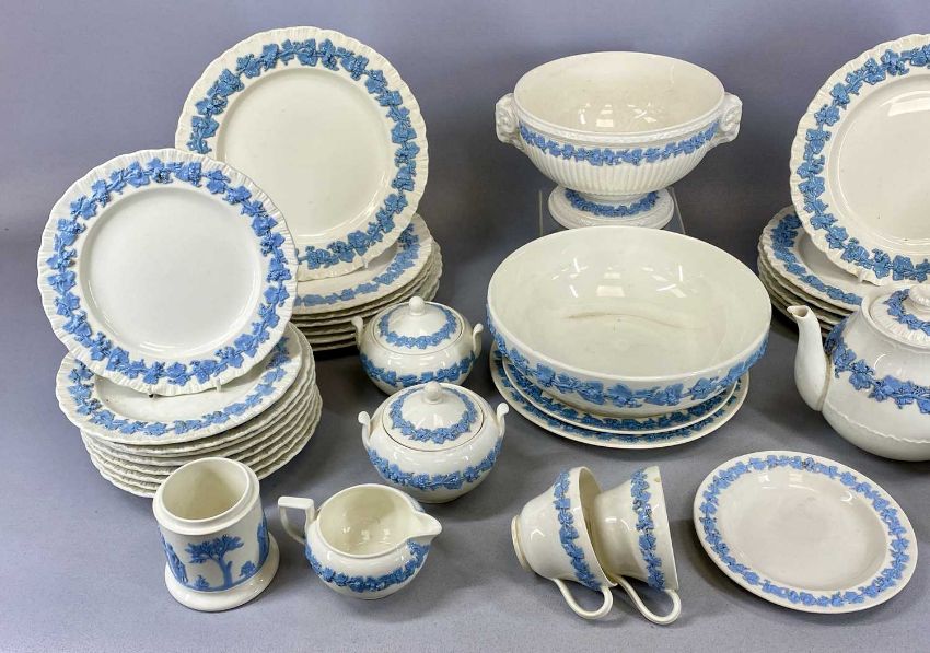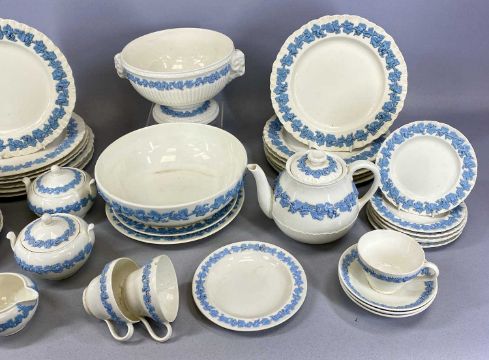 ASSORTED WEDGWOOD EMBOSSED QUEEN'S WARE TABLEWARE, including two fruit bowls, teapot, two lidded sugar basins and milk jug, quantity of dinner and side plates, etc.Provenance: The Cornelia Bayley Collection from the historic Welsh Jacobean house, Plas Teg, Flintshire. Further auctions to follow including Plas Teg Principal Interiors, further details on this important Jacobean house and its clearance Welsh House Clearance of a Generation — Rogers Jones Co