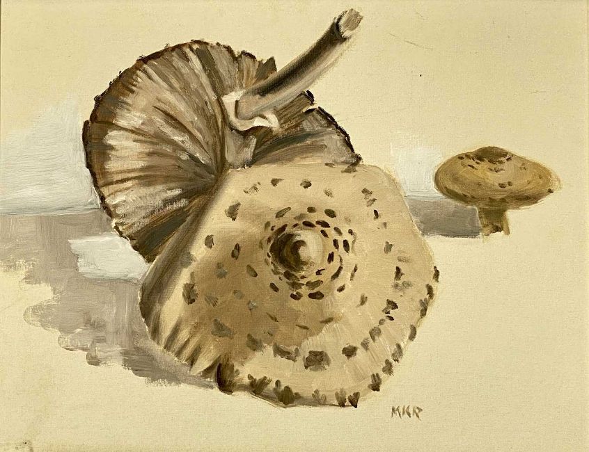 ‡ MARGERY K. ROBINSON (British 20th century) four works - oil on canvas entitled verso 'Aberlleiniog', 60 x 90, oil on canvas entitled verso 'Birkenhead Docks', signed lower right, 39 x 80cms, watercolour entitled verso 'Rain Cwm Idwal', 49 x 59cms, and oil on board entitled verso 'Parasol Mushrooms', monogrammed lower right, 39.5 x 49.5cms (4)Provenance: private collection ConwyComments: watercolour framed and glazed, others framed