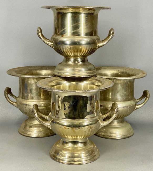 ASSORTED SILVER-PLATED ITEMS, including four two-handled champagne buckets, 23cms (h), large smoked glass claret jug, 32cms (h), various dishes and traysProvenance: The Cornelia Bayley Collection from the historic Welsh Jacobean house, Plas Teg, Flintshire. Further auctions to follow including Plas Teg Principal Interiors, further details on this important Jacobean house and its clearance Welsh House Clearance of a Generation — Rogers Jones Co