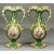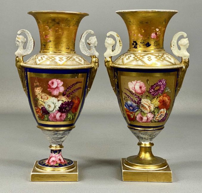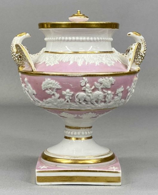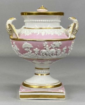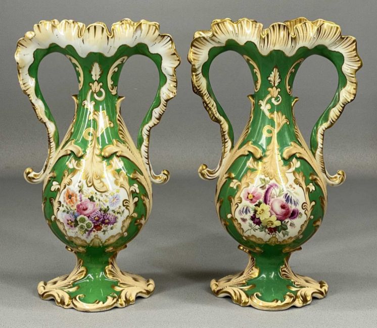 ASSORTED 19TH CENTURY DECORATIVE PORCELAIN, including pair of two-handled vases, heavily gilded, painted with bouquets of flowers, 28cms (diam.), pair of Rococo style two-handled vases, green and cream with gilded highlights, panels alternately decorated with bouquets of flowers and landscapes, 28cms (h), and hard-paste porcelain lidded urn-shaped vase with eagle form side handles, body having moulded relief decoration of figures, on square pedestal base, 17cms (h) (5)Provenance: The Cornelia Bayley Collection from the historic Welsh Jacobean house, Plas Teg, Flintshire. Further auctions to follow including Plas Teg Principal Interiors, further details on this important Jacobean house and its clearance Welsh House Clearance of a Generation — Rogers Jones Co