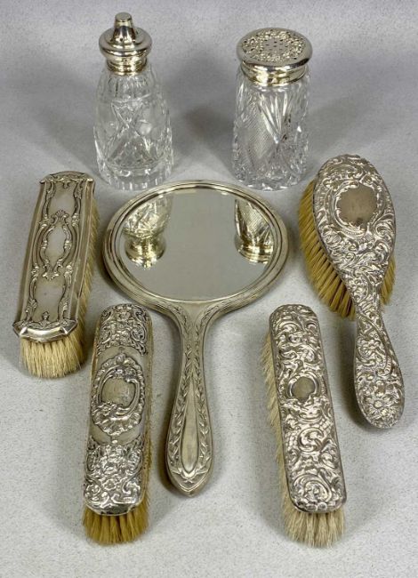 ASSORTED SILVER COLLECTABLES, including silver-backed hand mirror with engraved and embossed decoration, four embossed silver-backed hairbrushes, cut-glass silver-topped hat pin holder, and cut-glass silver-topped sugar casterProvenance: deceased estate Conwy