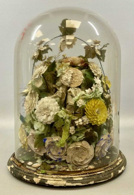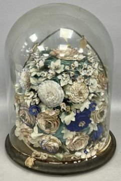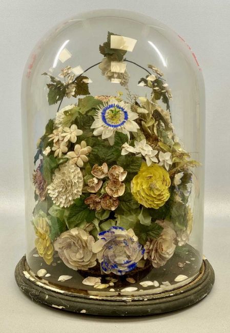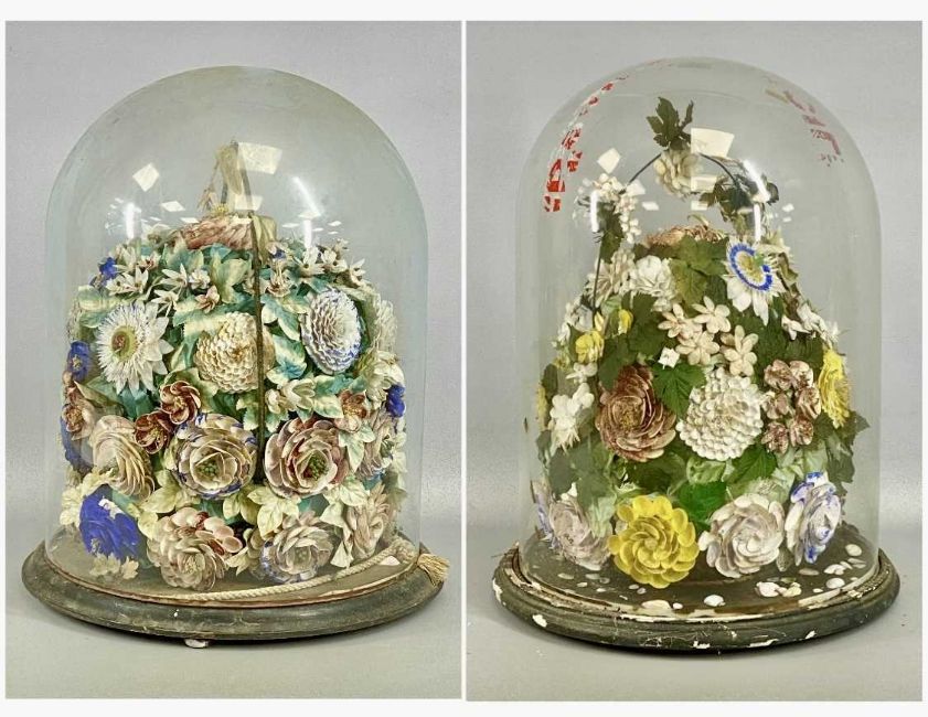 PAIR OF LARGE GLASS DOMES & STANDS, containing artificial floral arrangements, approx. 51 (h) x 33cms (diam.)Provenance: The Cornelia Bayley Collection from the historic Welsh Jacobean house, Plas Teg, Flintshire. Further auctions to follow including Plas Teg Principal Interiors, further details on this important Jacobean house and its clearance Welsh House Clearance of a Generation — Rogers Jones Co
