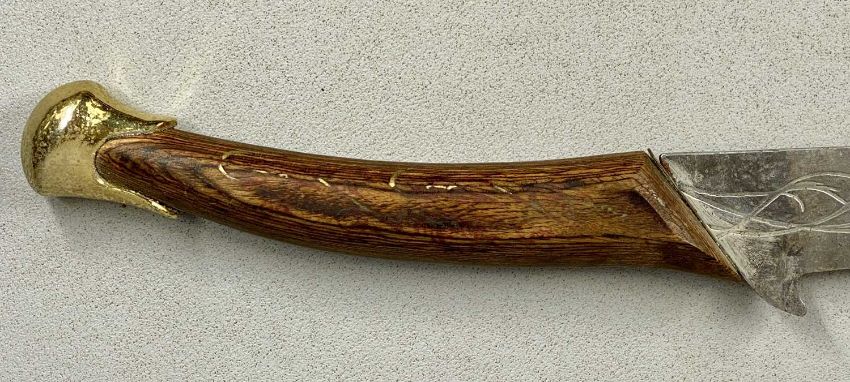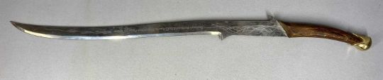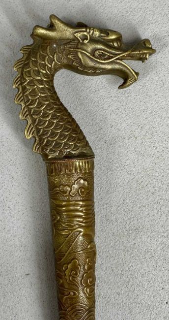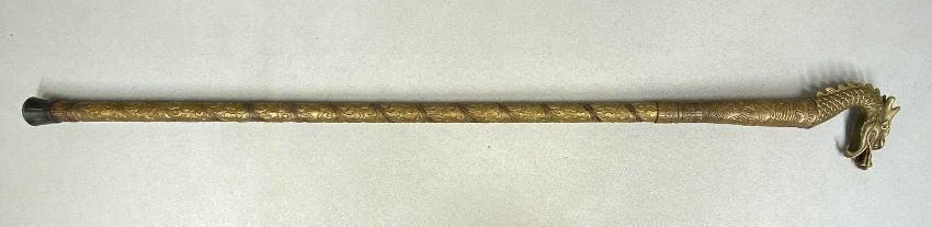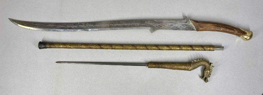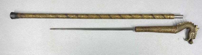SWORD STICK with 37cms square section steel blade, cast brass dragon form handle, and embossed brass scabbard, 92cms overall, along with a reproduction sword, curved 75cms single edged blade, engraved inscription, wooden handle with brass pommel, 97cms overall (2)Provenance: private collection Greater ManchesterPLEASE NOTE: ID and proof of age to be provided on collection