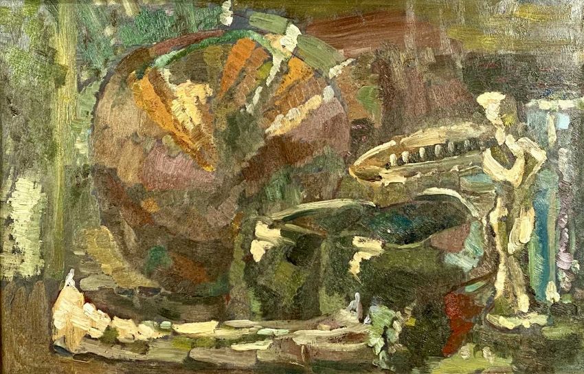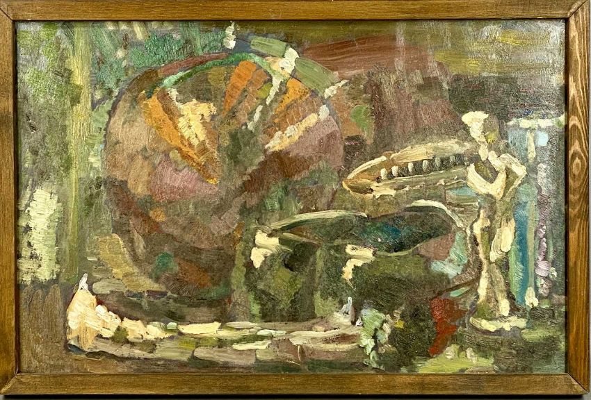 ‡ K.R. LEE oil on board - entitled verso 'Alice Down the Rabbit Hole', monogrammed, 50 x 60cms, and G. P. Austin oil on board - abstract still life, 32 x 50cmsProvenance: private collection DenbighshireComments: Lee framed and glazed, Austin framed