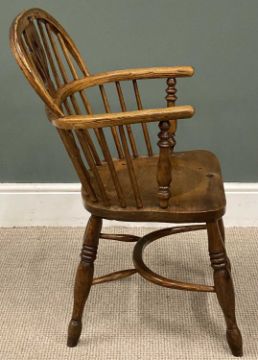 OAK & ELM VINTAGE WINDSOR CHAIR with low spindle and curved back, crinoline stretcher, 89 (h) x 52 (w) x 37cms (d)Provenance: deceased estate Conwy