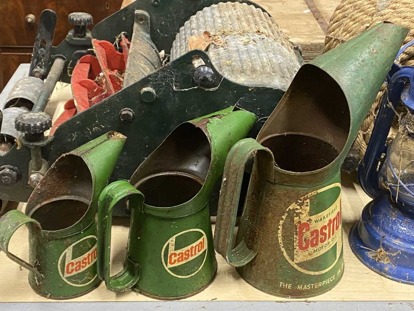 VINTAGE GARAGE ITEMS including graduated Castrol jugs, tilly lamps, rope, old lawn mower, etc.Provenance: private collection Anglesey